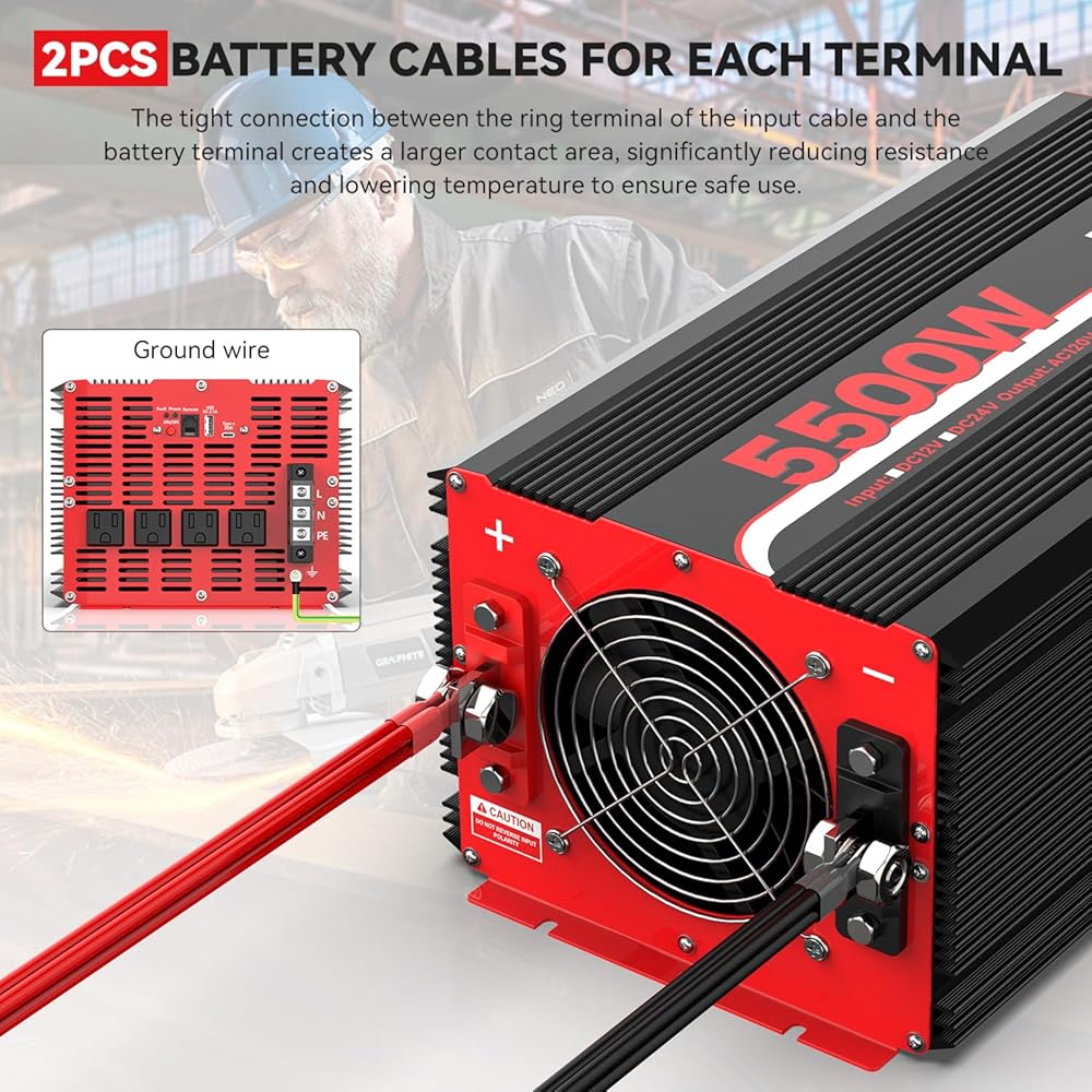 【ما ستحصل عليه】- محول طاقة 5500 واط 12 فولت، وحدة تحكم عن بعد بكابل 14.76 قدم، 4 قطع كابلات بطارية، دليل المستخدم. و 12 شهرا ضمان ما بعد البيع.