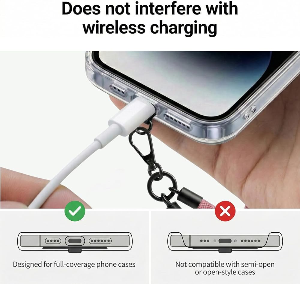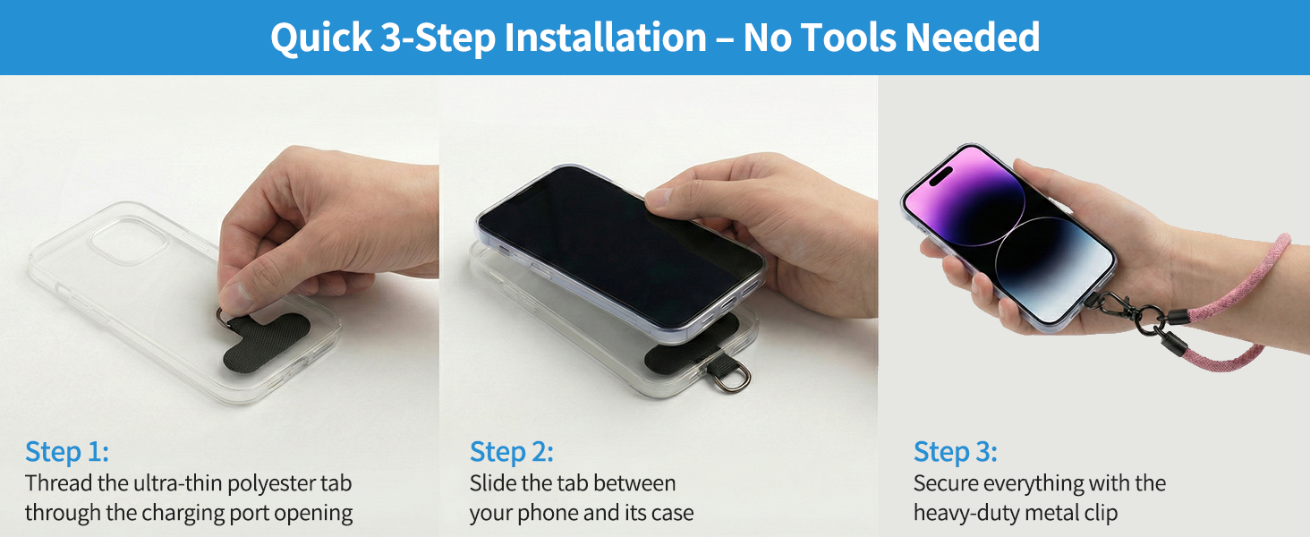 Quick One-Minute Installation: No tools or adhesives needed—just insert the reinforced washer through your case's charging hole, place in your phone, and clip on the strap; leaves no residue and allows instant case changes
