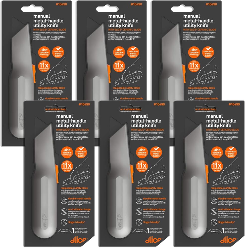 The Slice 10490 Manual metal-handle utility knife has the feel of a traditional utility knife, with a thick, heavy texture metal handle for a comfortable grip. Choose from three different cutting depths to find the safest blade length For the job. The 10490 ships with the thin, durable 10524 utility blade (rounded tip), and is compatible with the 10523 serrated utility blade and the 10525 Utility blade (pointed tip). All three blades feature our patent-pending finger-friendly edge that cuts effectively and is safe to the touch. Store extra blades in the easy-to-access blade garage at the back of the handle. Slice blades last up to 11 times longer than metal blades: when it's finally time to change your blade, No extra tools are required.