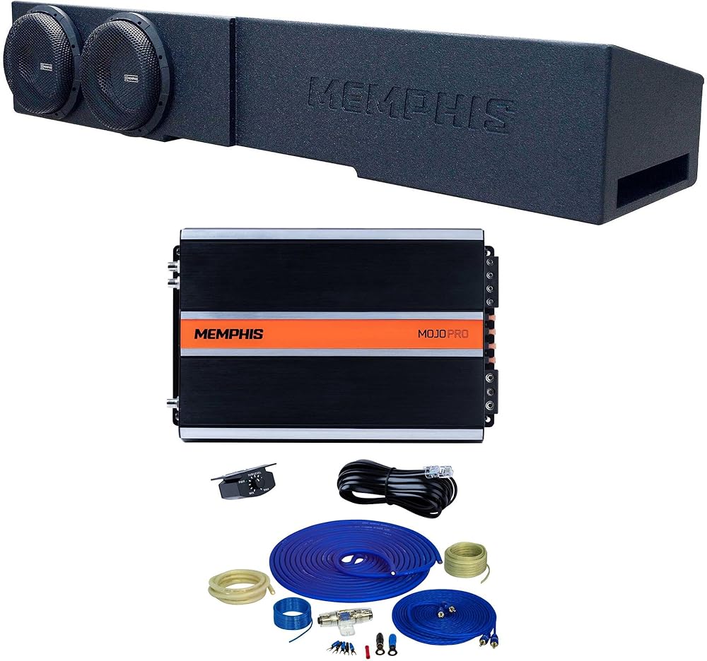 This bundle includes 1x Stinger SS1200XS 4GA Copper 1200W Complete Wiring Kit, 1x Memphis Audio MJP1500.1 Monoblock Subwoofer Amplifier - 1500 Watts RMS x 1 at 1-Ohm, and 1x Memphis Audio MJMECHEV8D1V2 Dual 8" Subwoofer Loaded Enclosure, 1 Ohm, Compatible with 2007+ Chevrolet & GMC Crew Cabs. Enhance your car audio system with this premium bundle. Stinger SS1200XS 4GA Copper 1200W Wiring Kit provides excellent power transfer with full copper construction, including 17FT blue power wire, 3FT ground wire, and more for a complete installation. The Memphis Audio MJP1500.1 Monoblock Subwoofer Amplifier delivers 1500 Watts RMS x 1 at 1-Ohm with features like variable EQ bass boost and extruded aluminum heatsink, ensuring top-notch sound quality. Additionally, the Memphis Audio MJMECHEV8D1V2 Dual 8" Subwoofer Loaded Enclosure is specifically designed for 2007+ Chevrolet & GMC Crew Cabs, housing two MOJO MINI 8” Subwoofers with a durable bedliner finish. With a ported enclosure, protective high excursion grills, and 1 ohm final impedance, this enclosure maximizes bass performance for your Chevy or GMC truck effortlessly. The subwoofers feature stitched foam surround and DVVC Direct Vent Voice Coil Cooling for exceptional audio output. Dimensions: Memphis Audio MJP1500.1 Amplifier - 7.5 x 2 x 11"; Memphis Audio MJMECHEV8D1V2 Enclosure fits 2007 and Newer Chevy & GMC Crew Cab Trucks. Power up your car's sound system with this meticulously designed bundle, offering convenience, powerful performance, and a perfect fit for your Chevrolet or GMC truck model.