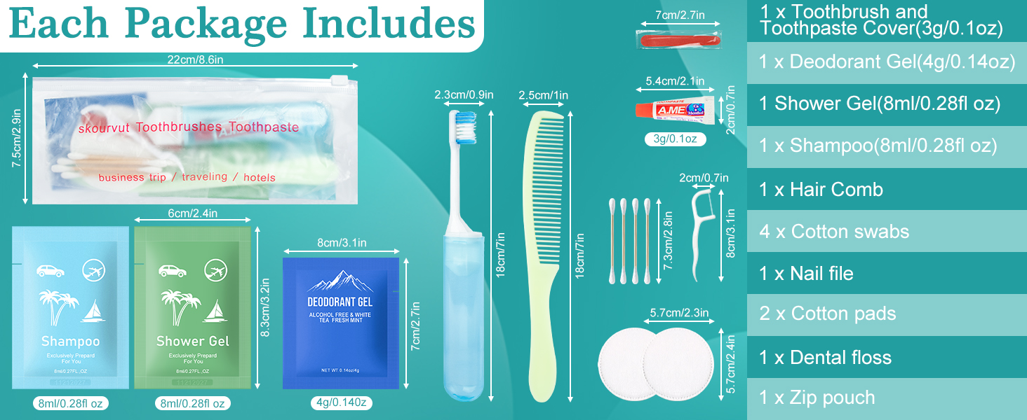 1.Basic toiletry kits:you will receive 10 travel hygiene kit for homeless in bulk.The homeless care package supplies bulk comes in a convenient zippered bag and contains:1 Toothbrush and toothpaste inside the lid(3g/0.1oz),1 Deodorant Gel(4g/0.14oz),1 shampoo(20ml/0.7fl),1 Hair Comb,1 Hotel Vanity Kit and 1 Bar Soap(0.5oz/lavender).Affluentn both quantity and variety,this amenities kit is suitable for men and women and fully meet your needs when traveling.