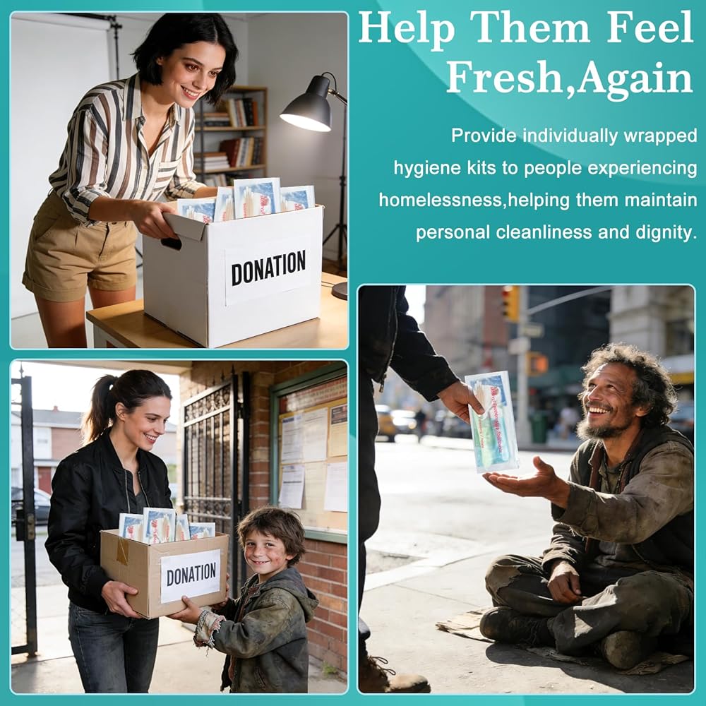 3.Good donation choice:This bulk toiletries for homeless is made of high-quality materials.Packed in small sachets that are leak proof and preserve freshness.The complete portable set helps maintain homeless care package,making travel size hygiene kit an ideal gift for those in need.