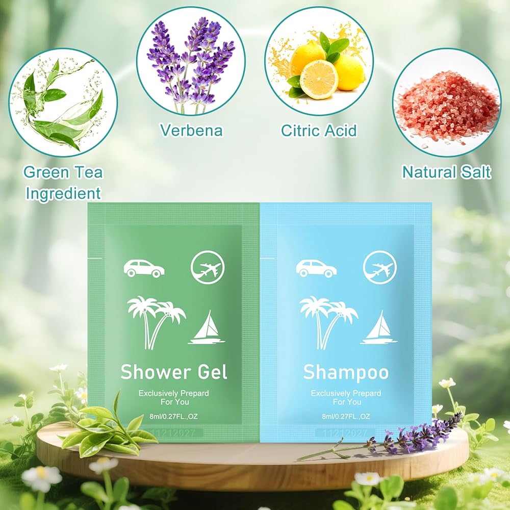 4.Good quality:the ingredients of mini travel size toiletries are suitable for all skin types,shampoo bulk travel ingredients is green tea and do not contain any harmful.