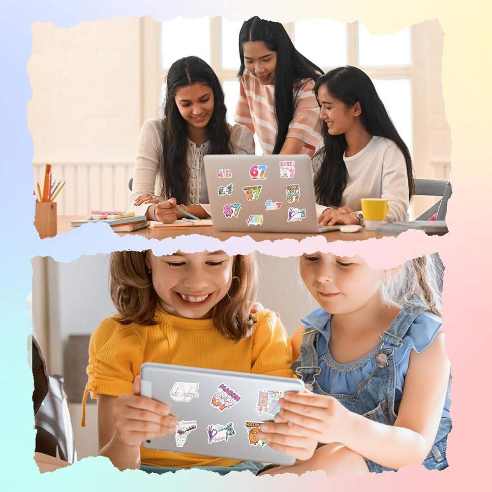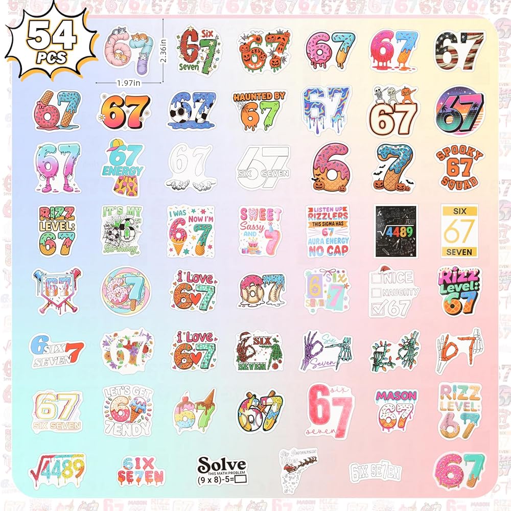【Set of 54 Stickers with Trending 6 7 Memes】This pack includes 54 unique stickers featuring viral 6 7 meme designs, perfect for adding humor and personality to phones, laptops, water bottles, and everyday items.