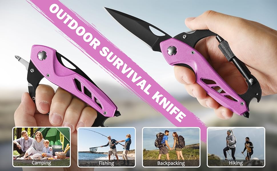 Pink Multitool Carabiner Knife for Women Men,Survival Gear for Camping Hiking,EDC Carabiners, 6-in-1 Multi Tools with Window Breaker, Bottle Opener and Screwdriver,Gifts for Women/Men (Pink)