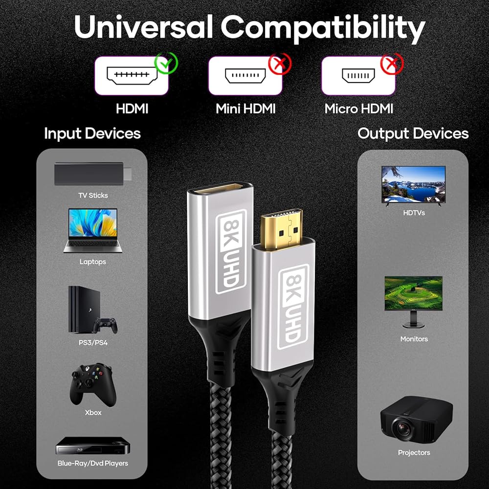 Full compatibility: The HDMI extension cable is suitable for all HDMI devices,such as TV sticks,HDTVs,monitors,PS5/4/3,projectors,VR headsets,graphics cards,Blu-ray DVD players,Chromecast,Miracast dongles,TVs,computers,and other devices.