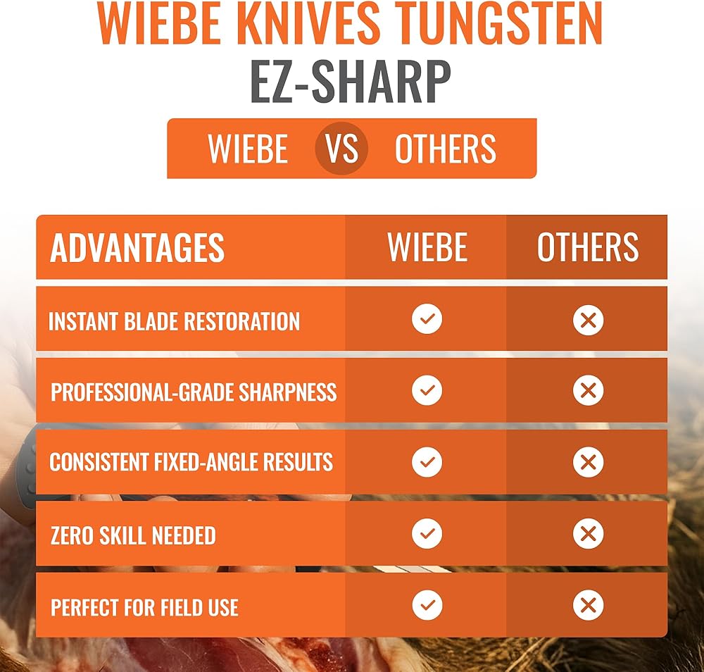 The mystery is gone. Knife sharpening can be quick and easy. Stop struggling with bulky stones or complex guided systems. The WIEBE Tungsten EZ-Sharp delivers rapid edge restoration for your most important tools. Designed for hunters, tradesmen, and EDC enthusiasts, this is the definitive ultra-portable emergency knife sharpener. Why Tungsten? Tungsten Carbide is renowned for its extreme hardness, allowing it to rapidly cut and reform the edge geometry of severely dull or abused blades. You will literally feel the edge being reprofiled to a level of performance that ensures safety and efficiency. Keep one in your truck, fishing vest, or gear bag for a quick, dependable edge, anytime, anywhere. The EZ-Sharp is your ideal tungsten sharpener for hunting knives and your essential easy-to-use sharpener no skill required. WARNING: NOT FOR CHEF KNIVES This tool is purpose-built for the fast repair of robust utility knives and pocket folders. To ensure the longevity of your delicate or expensive kitchen knives, please use a whetstone. The EZ-Sharp is for the rugged, working edge you need in the field.