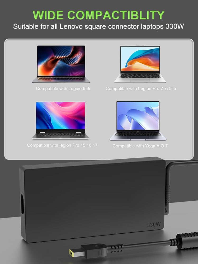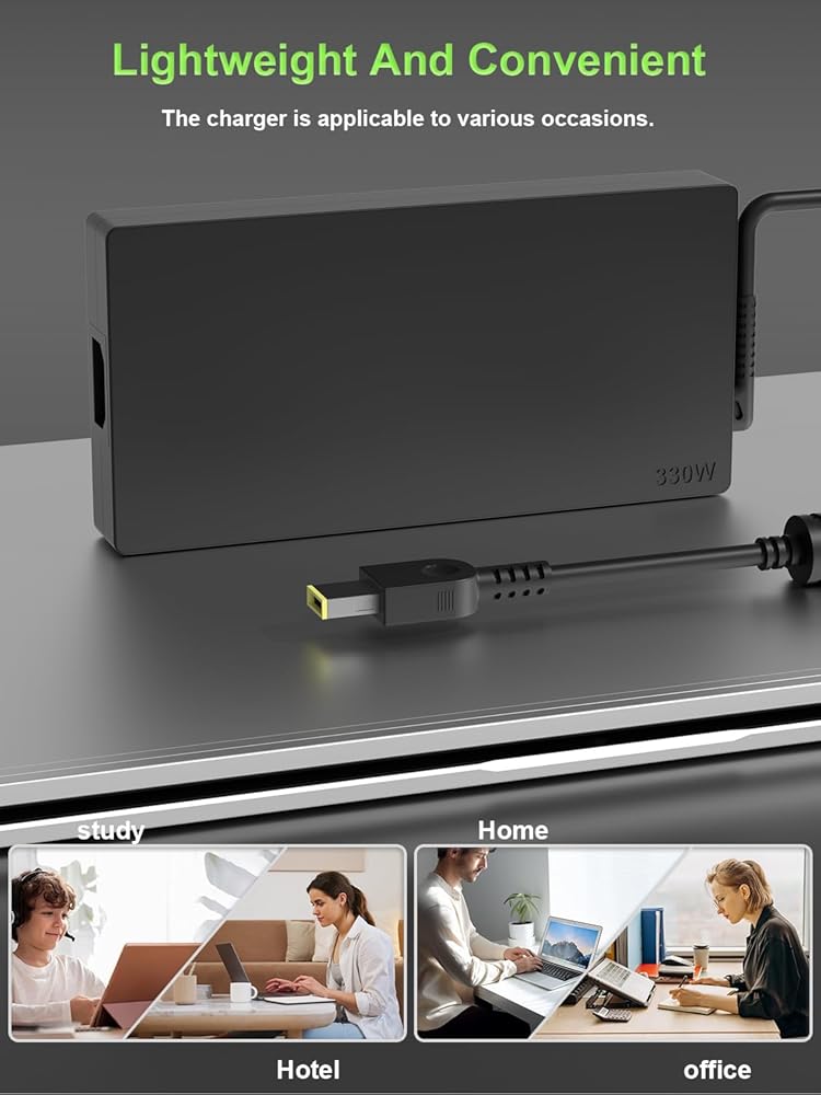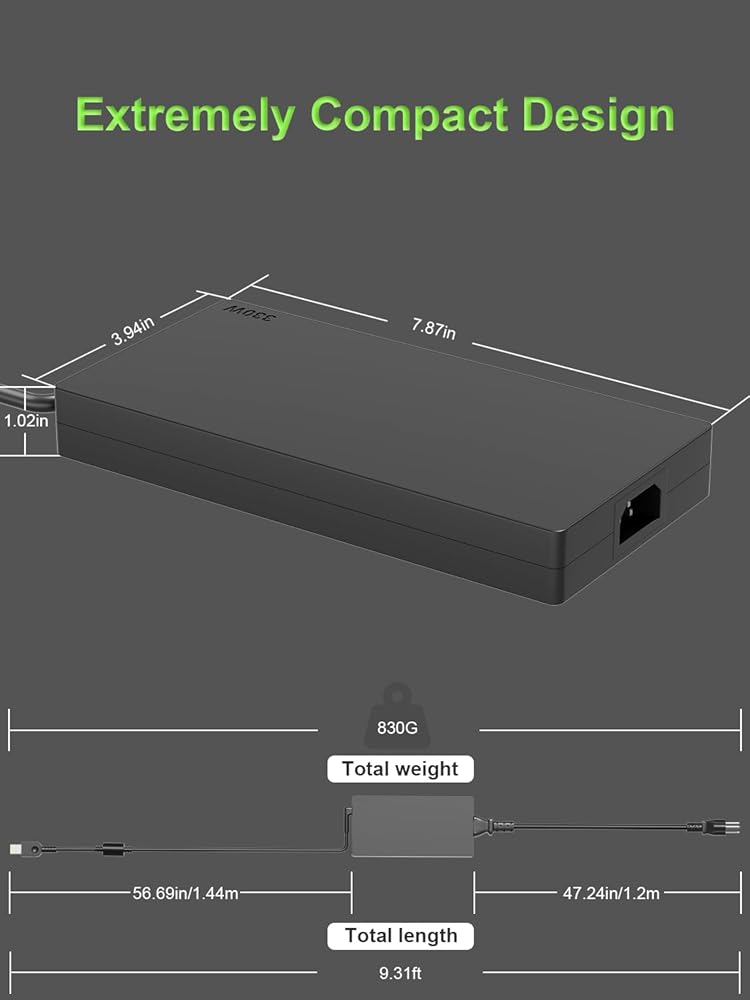 Adapter Specs: Output Voltage Standards:20V 16.5A 330W MAX, Input Voltage Standards: 100-240V, 50-60Hz (Worldwide use). Power Jack Port Connector Type: Square Yellow Slim Tip (It is not work laptops requiring more than 330W)