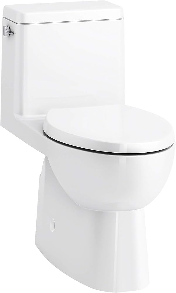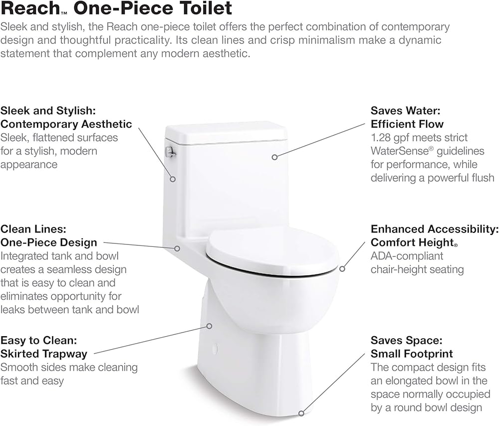 KOHLER 78080-0 Reach Comfort Height Chair Height One-Piece Compact Elongated Toilet with Skirted Trapway, Left-Hand Trip Lever, 1.28 GPF