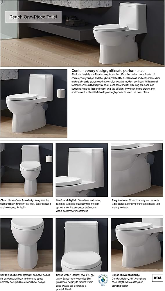 - Easy-to-clean, one-piece toilet with powerful 128 GPF