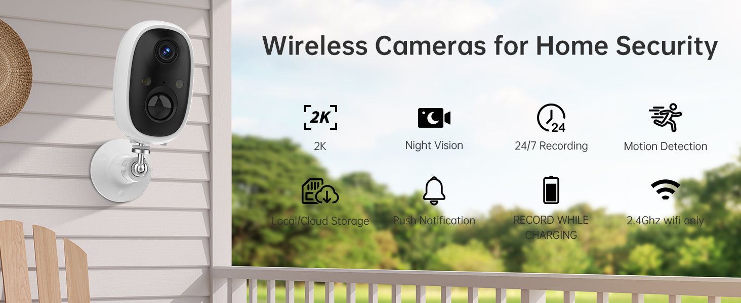 【2K HD Image&Color Night Vision】Outdoor camera wireless features 2K high-definition live video and image.The outside camera has two modes of night vision,full color and infrared night vision with a 33ft visible range,it will offer a clear wide video of any area you wish to monitor even at night.With the Mobile app,the system's live or recorded video can be accessed from anywhere at any time