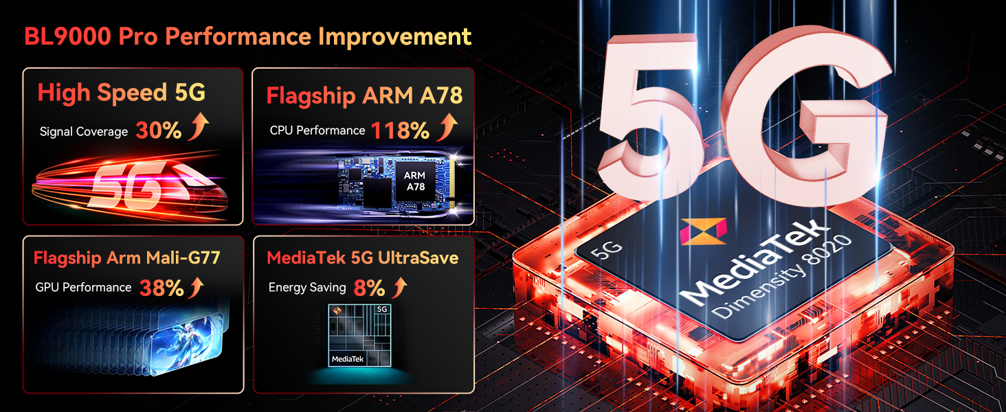 【5G Powerful Octa-Core Processor, 36GB+512GB, Dual-Band WiFi 6】 Blackview BL9000Pro 5G Rugged Smartphone is powered by TSMC Octa-Core MediaTek Dimensity 8020 5G Processor, 2.6GHz and leading 6nm process to ensure smooth operation of daily applications and demanding games.Dual-band WiFi6 ensures seamless connectivity across 2.4GHz and 5GHz frequencies, delivering stronger, faster connections for quick downloads, superior gaming, fluid streaming, and flawless video conferencing. 36GB RAM (12GB+24GB virtual RAM) and 512GB ROM with simultaneous support for up to 49 background apps provide plenty of storage for all your apps, photos, videos, and files.