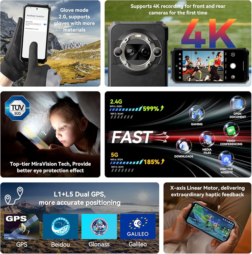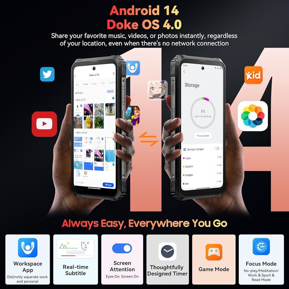 【Latest Android 14 phone & Doke OS 4.0 System】This BL9000 Pro rugged android phone equipped with the latest Android 14 operating system, enhancing privacy protection and prevented privacy leakage from the root cause.This Android 14 smartphone offers per-app language preferences, improved UI experience, outdoor tools. Add Workspace App, distinctly separate workand personal. But that's not all! With the integration of Doke OS 4.0, enjoy additional functionalities like call recording and exercise index tracking. Additionally, Provide real-time subtitles while watching videos, and a richer functional experience.