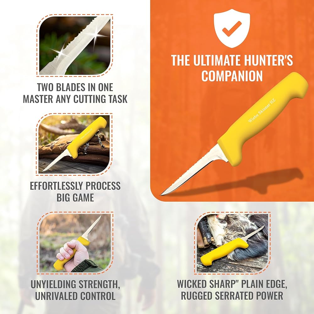 TWO BLADES IN ONE – MASTER ANY CUTTING TASK: Unleash ultimate versatility with the Skinner HZ! Features a rugged 4-inch fixed blade with two distinct, purpose-built edges: a powerful Serrated Saw Edge for cutting through tough hide, cartilage, and small bones, PLUS a "Wicked Sharp" Precision Plain Edge for flawless skinning and deboning.