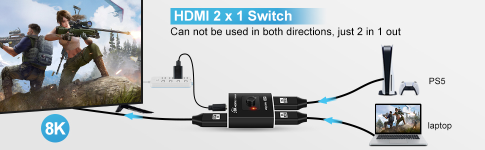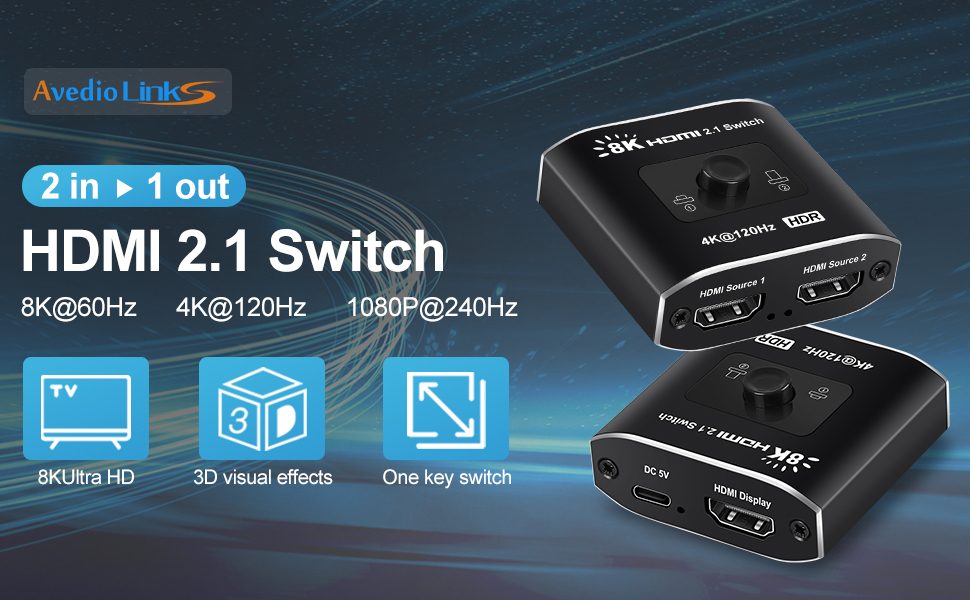 avedio links HDMI 2.1 Switch 2 in 1 Out 8K@60Hz, 4K@120Hz HDMI Switch for PS5/XSX, High Speed 48Gbps 2 Port HDMI Splitter Switch Support 1080P@240Hz for TV, Monitor, Projector