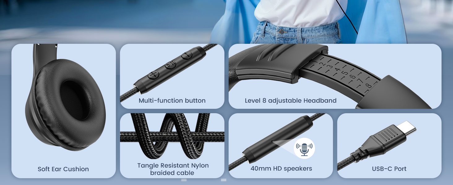 USB C Wired Over-Ear Headphones, Corded Stereo Headsets with Microphone, Volume Control, Comfortable Fit Foldable Headphone for iPhone 15/16/17, Samsung, Laptop, Tablets, Travel(Black)