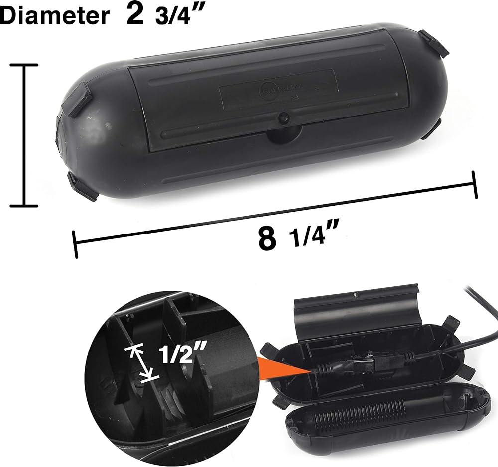 PROTECTIVE COVER CAN FIT UP TO 12 GAUGE CORDS - The protector encasement has a length of 8.25 inches and a diameter of 2.75 inches. The wire entry points can accommodate up to 12-gauge cords while the large plug compartment can comfortably fit average domestic electrical outlet plugs including 3-prong plugs. The opening is only 0.4-inch, ensuring that the fit will be tight no matter the size of the cord.