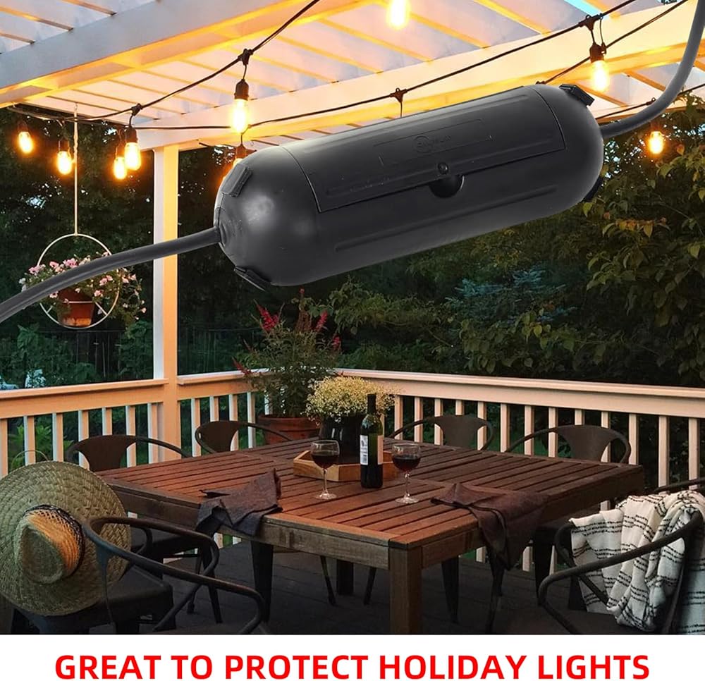 (4-Pack) Large Black Outdoor Extension Cord Plug Protector for AWG12/14/16 Cords | Water-Resistant Holder for Holiday String Lights and Wires | Capsule Shaped Protector with Large Compartment