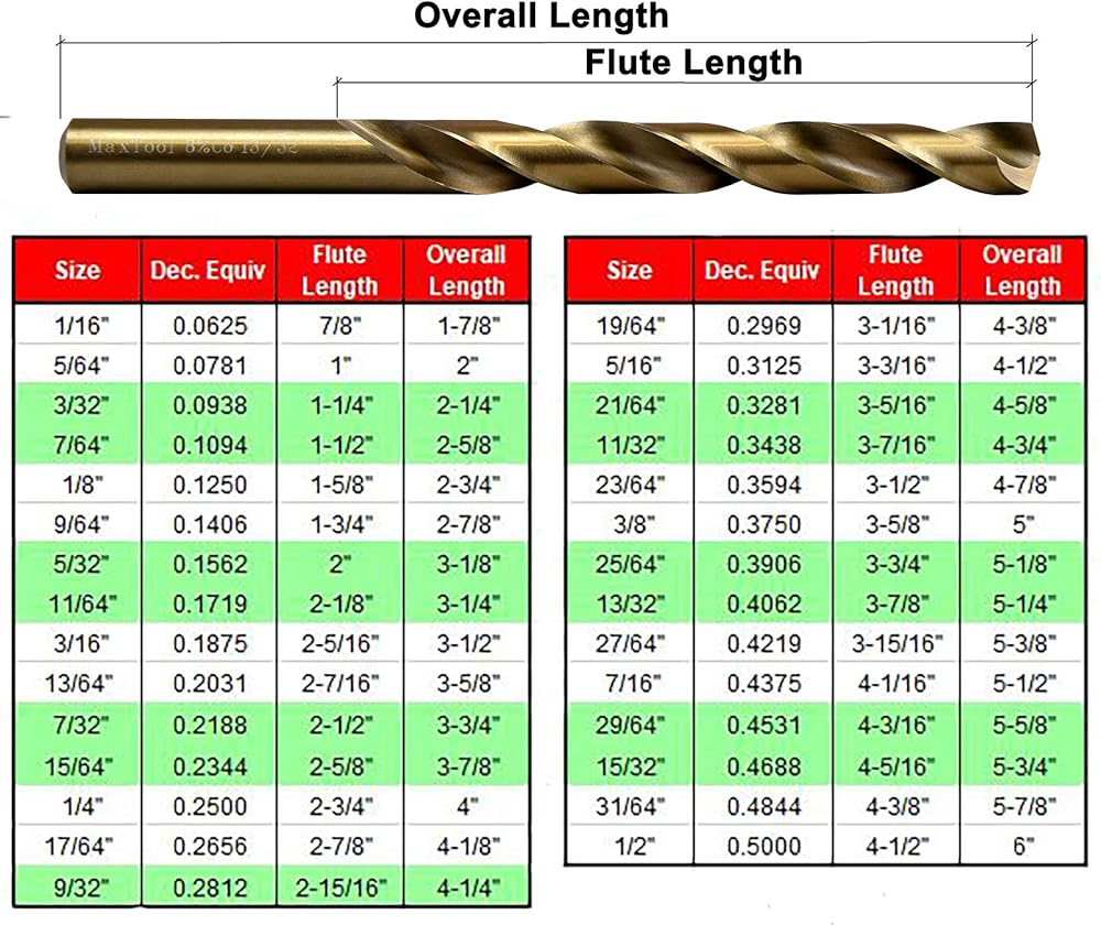 All drills can be used for cutting metal, plastic, wood, etc. Quality Cobalt high speed steel M35 or M42 ensures sharp and fast execution in any material for clean results. Premium Heat treated is durable and can withstand heavy duty operation for a long tool life. Golden Color Surface Treatment holds up lubricant better for smoother drilling. Precision ground with geometry of 135 degree chisel with split point for quick penetration and an accurate start.