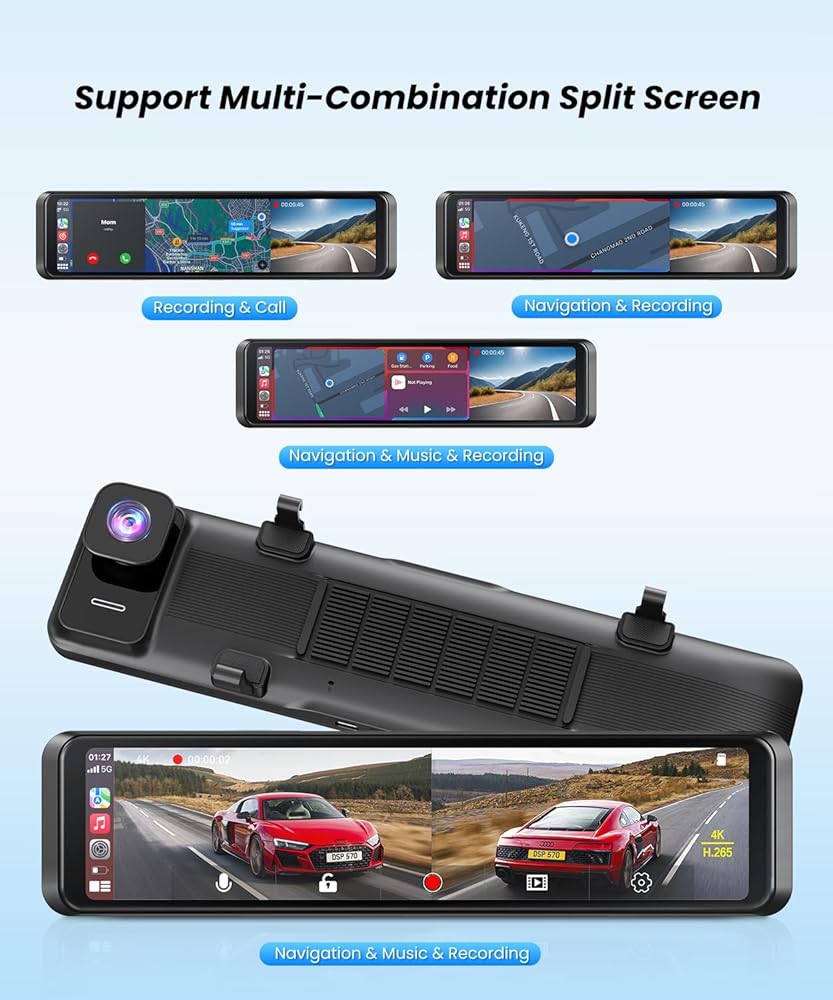 Seamless Wireless Connectivity with CarPlay & Android Auto: Enjoy hands-free convenience with the carplay screen for car that wirelessly connects to your smartphone. Access navigation, music, calls, and more through voice commands or the responsive 11.26'' IPS touchscreen. This rear view mirror dash cam integrates seamlessly with Siri or Google Assistant, allowing you to stay focused on the road while enjoying a smarter driving experience