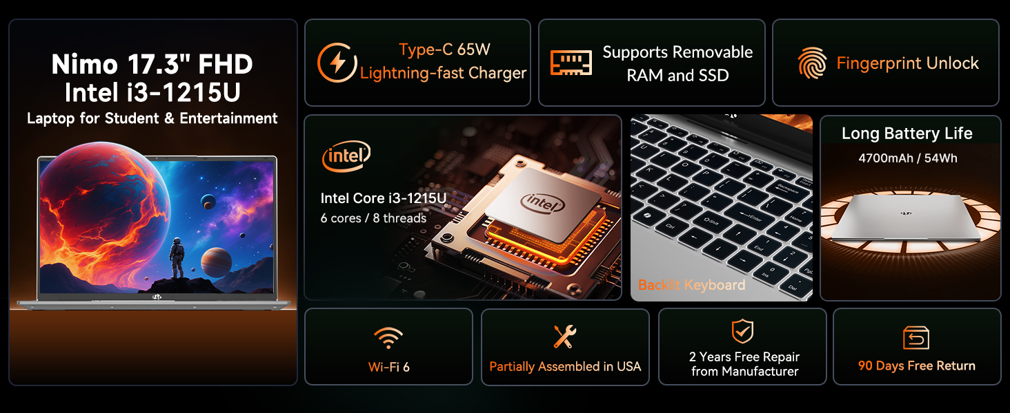 NIMO 17 Inch FHD Laptop, 6 Cores i3-1215U (Beat Ryzen 5 7520U, Up to 4.4GHz) 8GB RAM 256GB SSD Computer with 65W Type C Backlit KB Wi-Fi 6 Fingerprint, for Home School and Business