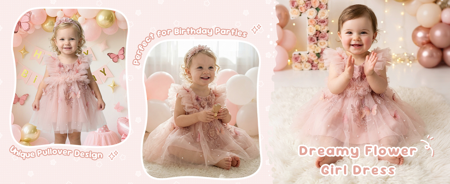【Design】This Baby Girls Butterfly Birthday Dress features flutter sleeves with layered ruffled details extending to the back, decorated with vivid 3D butterfly patterns and delicate pearl accents. Its back adopts a ruffled flutter sleeve extension design paired with velvet lining splicing, and uses a pullover style for easy on and off for little ones—no zipper needed. The dreamy, photo-worthy look perfectly fits first birthday celebrations, wedding flower girl duties, and professional photo shoots.