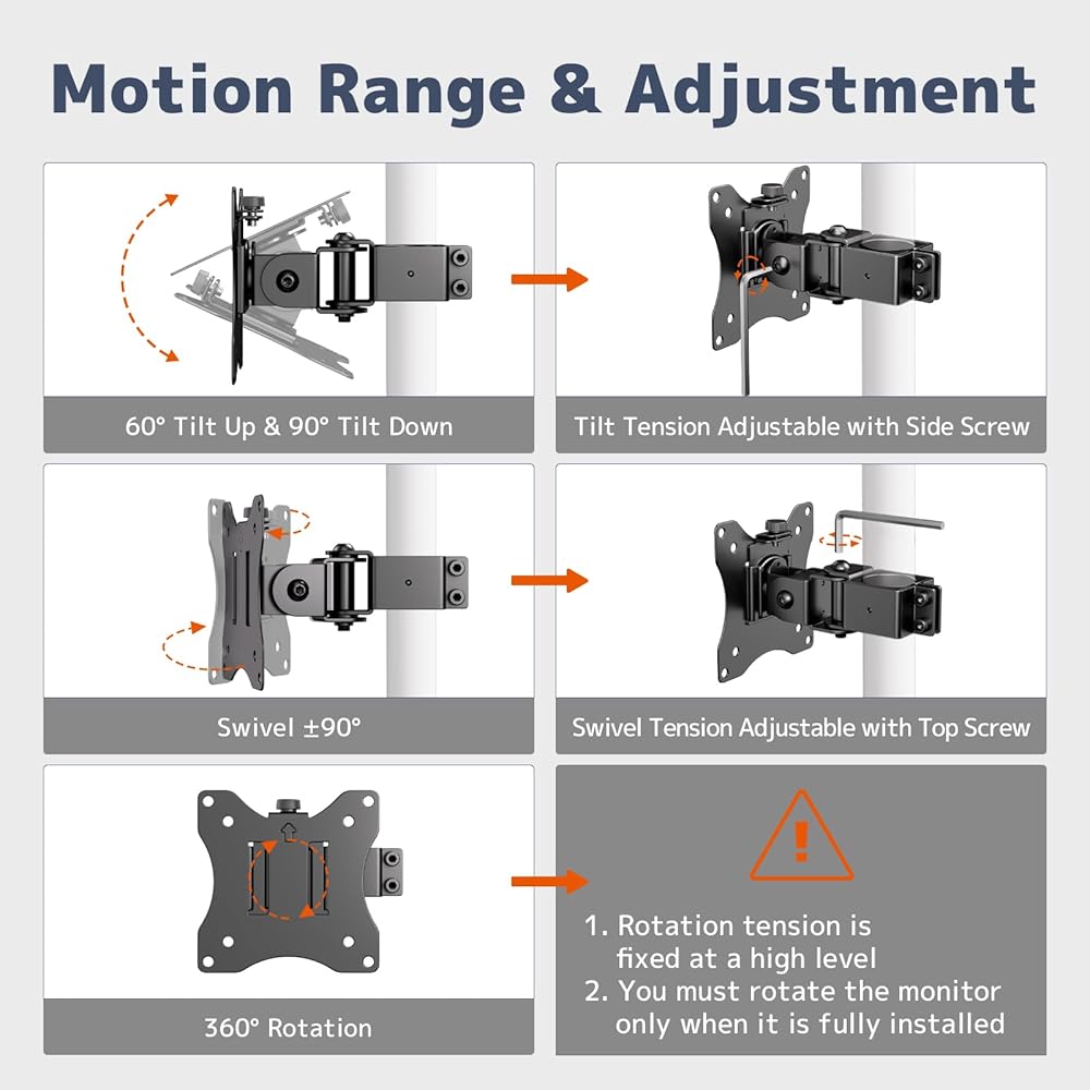Flexible Ergonomics for Ultimate Comfort & Viewing:Achieve the perfect viewing angle to combat neck and eye strain. Our full-motion design provides smooth +60° upward tilt and -90° downward tilt to eliminate glare. Swivel left or right ±90° for easy screen sharing, and enjoy 360° rotation when fully installed. The independent side and top tension screws allow you to customize the stability and resistance for a secure yet easily adjustable experience, enhancing your workflow and comfort