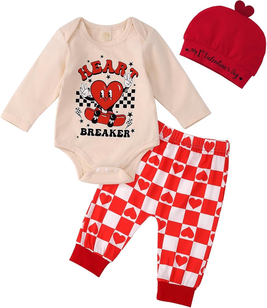 LOVE-FILLED DESIGN: My First Valentines Day Baby Boy Outfit that your baby look extra cute during the Valentines Day.Features the pants repeating cute heart-shaped chessboard print, making it a perfect Valentine's Day-themed outfit for your little prince