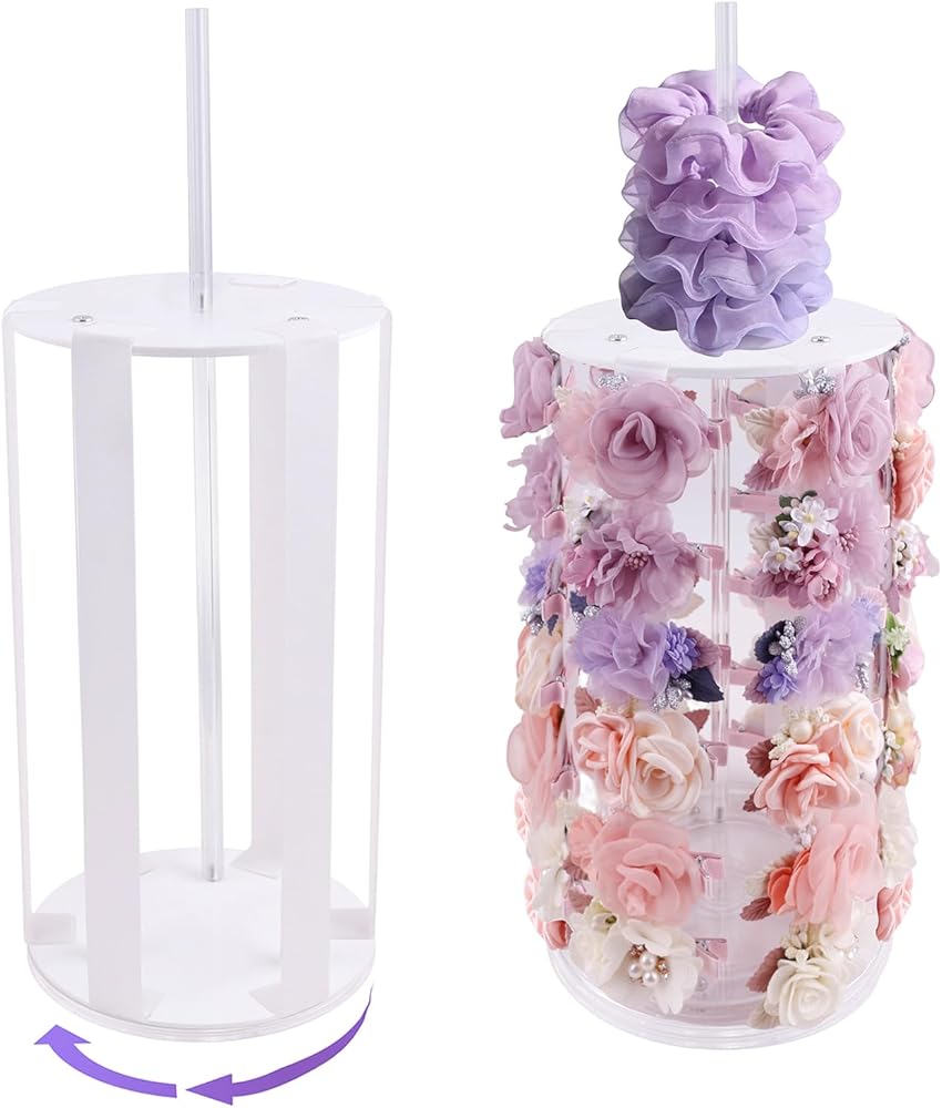 ROTATION BASE DESIGN - The innovative hair bow holder features 360° rotating base, allowing your girls to easily view and access her hair accessories. Its compact, vertical structure saves space on desks, dressers or closet, keeping rooms tidy and clean.