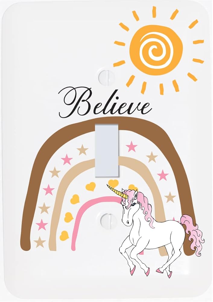 Boho Unicorn Sun and Rainbow Girls Light Switch Plate and Outlet Covers with Believe Inspirational Motivational Sayings, This Bohemian Wall Plate with Unicorns, Rainbow and Sun images are printed on a Gloss White Light Switch Wall Plates and Outlet Covers are sure to add the finishing touches to your Farmhouse style s Baby Girls Nursery or Children's Farmhouse Style Room Wall Décor. This unicorn wall saying comes complete with white Screws for quick install in your Boys nursery room, bathroom, bedroom, or playroom. These make a perfect gift Idea, for baby showers, birthday parties, house warming Farmhouse gifts.
