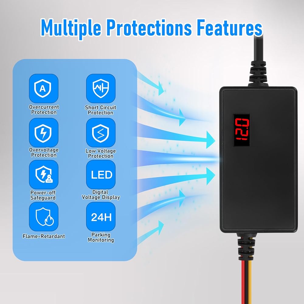 [Intelligent Switching Modes] The kit automatically switches the driving recorder to park mode when the vehicle engine is off and switches to normal recording mode when the engine is on. it also features auto detection of car battery voltage.