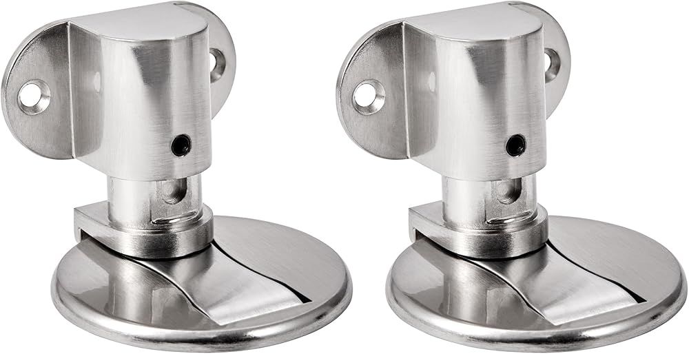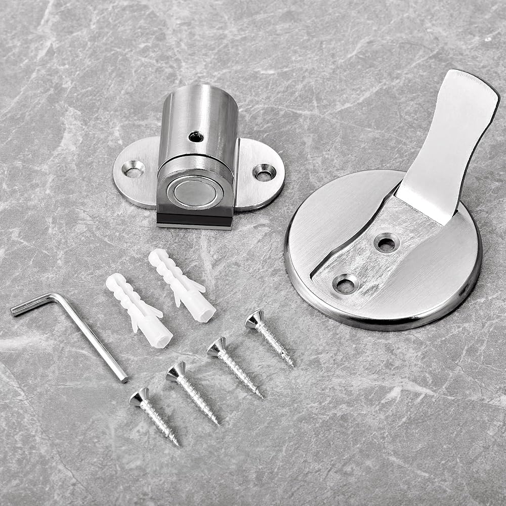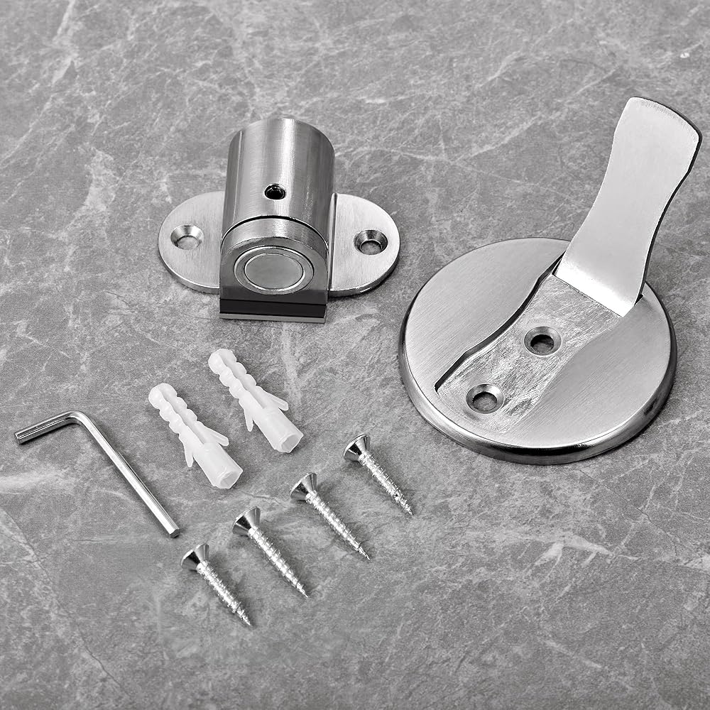 【Adjustable & Invisible Metal Door Stop】This door stop is equipped with a wrench, which can be adjusted freely and is suitable for clearances between 0.2 inches and 1.2 inches. Before installation, use the hexagon wrench to adjust the correct height. 【Strong Magnetic】Magnetic door stopper is designed to hold the door securely in place. It prevents the door from closing suddenly on windy days.Make Your kids and pets enjoy themselves and keep away from injury by heavy slamming doors. Make your work more relax!The floor door stopper can effectively protect your walls from damage. 【High Quality & Durable】Our magnetic door stopper is made of zinc alloy metal. The brushed stainless steel finish resists daily scuffing and corrosion for long-term durability and reliability. magnetic door stopper on the ground without bumps will not trip feet, door close to the blocking piece will only pop up,Does not take up space, It won't affect the daily cleaning and not easy to trip children. 【Widely Use For Any Surfaces】A door stop can be attached to varieties of smooth surfaces. Wood,glass,metal,marble walls,composite material,etc.The magnetic door stopper is functional, beautiful and fits many decorating styles.for the doors of your living room, bedroom, bathroom, hotel, office, etc. 【Multiple Mounting Options】Door stop is packaged with double-sided adhesive tape and screw fittings. The adhesive door stop is easy to install and can be installed without tools. The screwed-in installation allows you to use it for a longer period of time.Note: please clean the dirt on the wall and door before installation! double-sided adhesive tapes do not suit paint walls,wallpapers,and uneven surfaces,please you can install them permanently using screws.