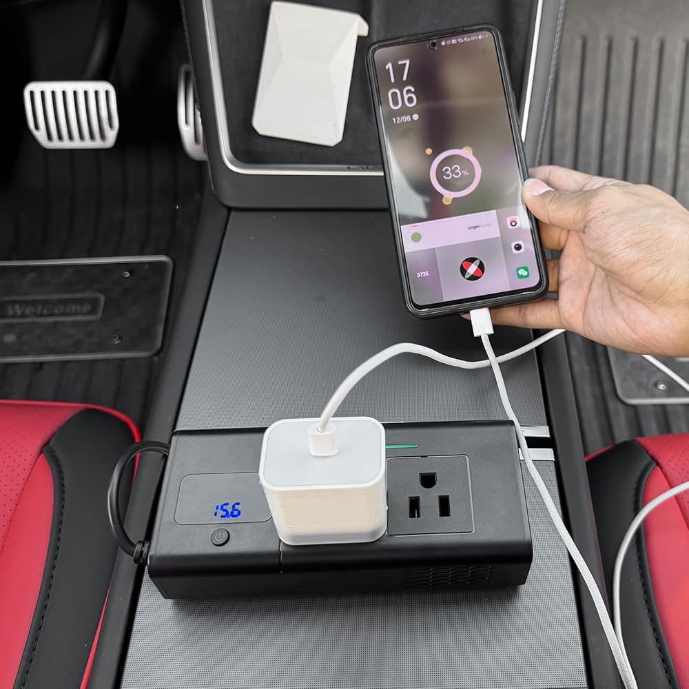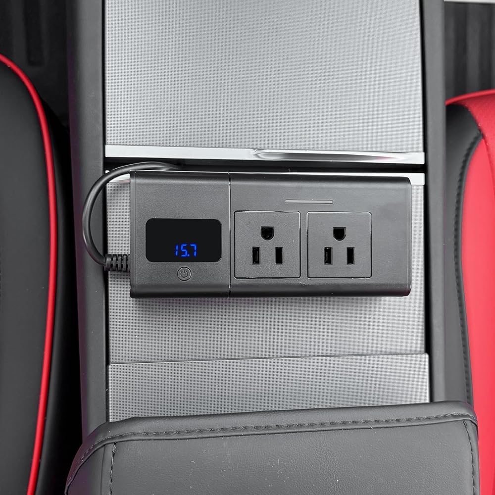 Powerful 200W inverter: The 200W Power Inverter for model y and juniper Equipped with two US-standard 110V AC outlets easily power multiple devices simultaneously without draining the Tesla battery. Whether it's for road trips, camping, or mobile office use, it can provide reliable power anytime and anywhere.