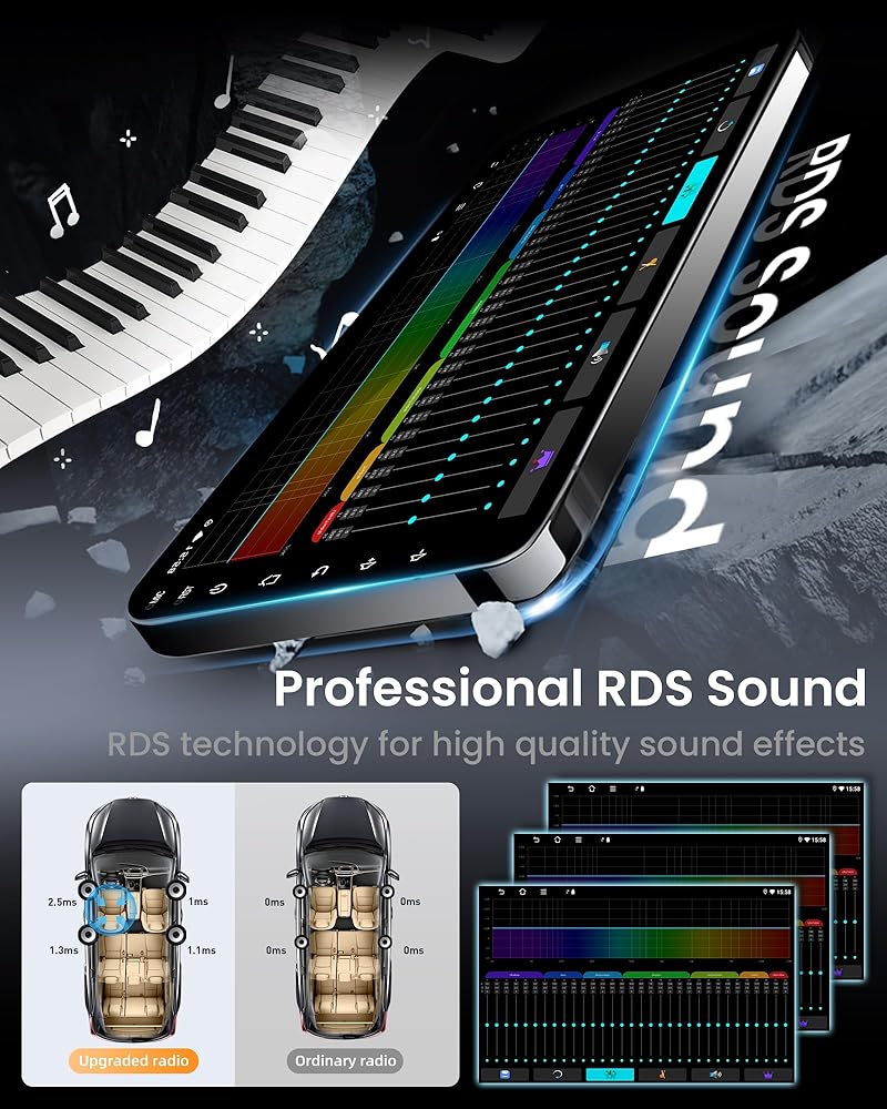 【FM/AM & DSP Sound Radio】Engineered with a built-in high-performance DSP sound processor and 32-band EQ, this car stereo lets you fine-tune every detail of your audio. Enjoy immersive surround sound right in your vehicle. The integrated RDS and high-sensitivity FM/AM radio chip deliver clear, stable reception—even at high speeds or in remote locations—so your music never misses a beat