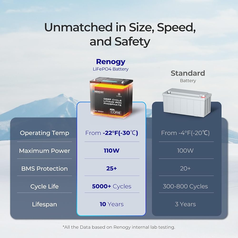【Enhanced Performance, Longer Lifespan】Lab Tested battery performance for over 5000 valid cycles life at 80% DOD. The heating tech reaches at a maximum of 110W and save 40% of heating time to protect the battery under extreme cold weather. This makes RENOGY REGO battery a much longer lifespan and extremely safe battery.