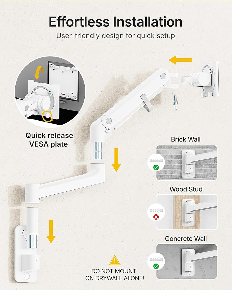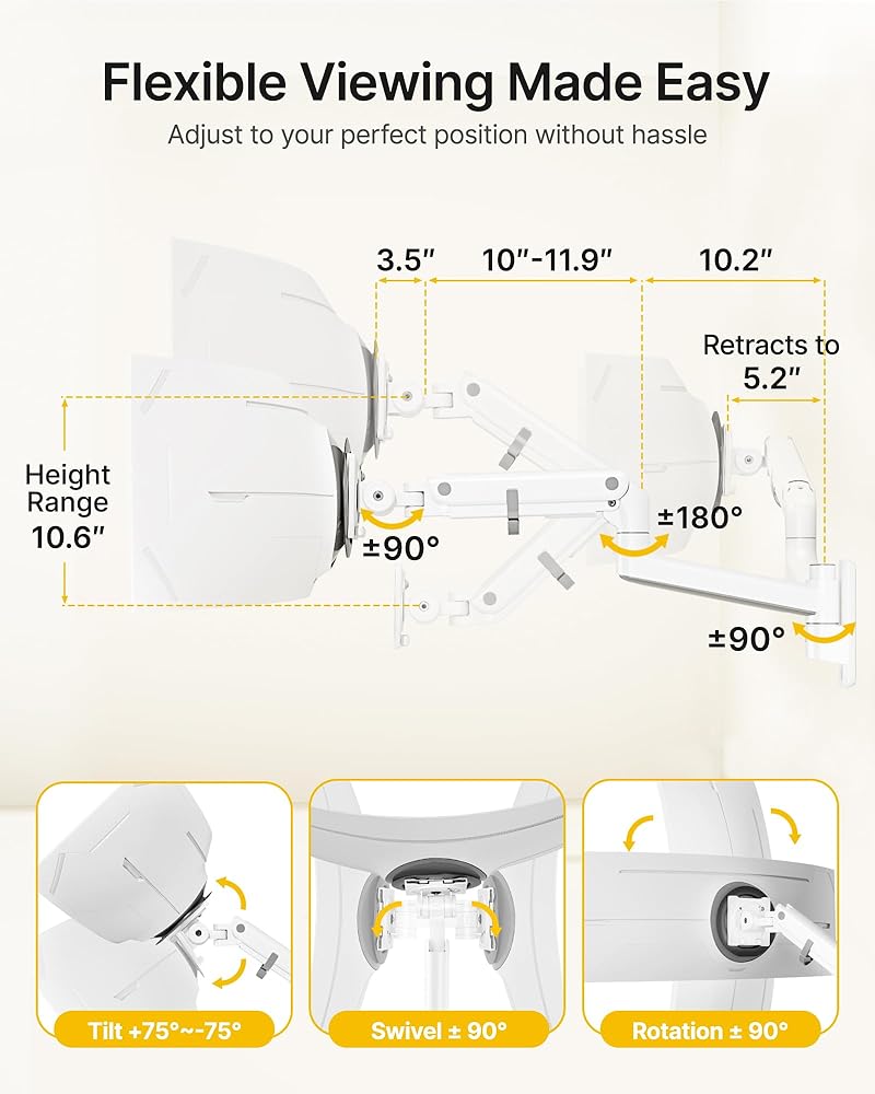 This monTEK bundle combines a premium gas-spring monitor wall mount with a universal VESA extension adapter, offering a flexible and highly compatible mounting solution for a wide range of screens. The wall mount supports 17"–57" monitors weighing 4.4–59.4 lbs and provides full-motion adjustments, including tilt, swivel, rotation, and up to 27.4" extension for comfortable, ergonomic viewing. Built from durable steel and aluminum, both components feature a sleek black finish that blends into any workspace. Cable management keeps wires organized, and the mount installs securely on wood studs, brick, or concrete walls. This bundle gives you a versatile, space-saving, and reliable setup for work, entertainment, or gaming environments.