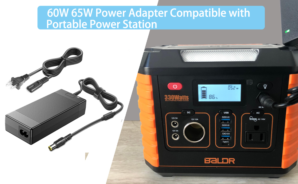 【BALDR portable power station power adapter Specifications 】Input:100-240V,50-60Hz; Output:65Watt, Positive Tip; Free Extra Long AC Cable Include. Total BALDR Charger Cord Length 10FT.