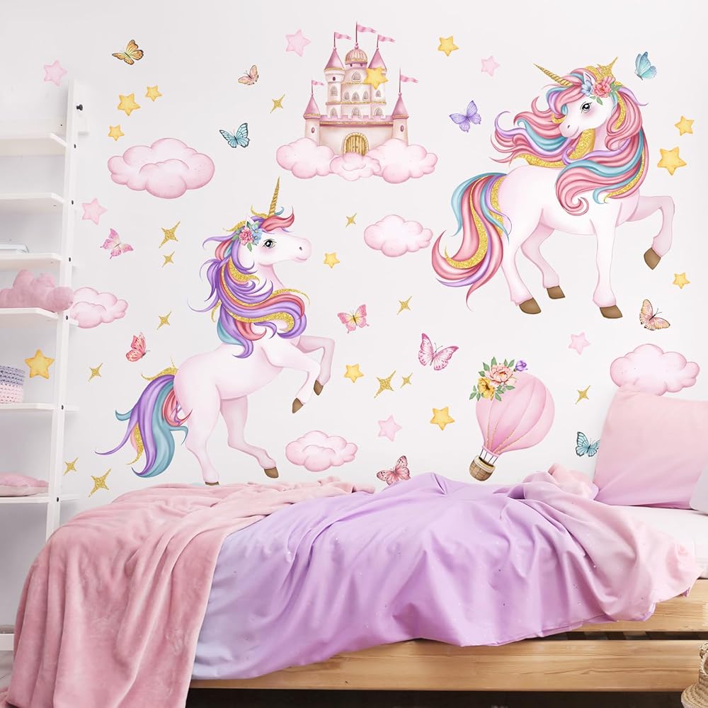 Tanlaby Unicorn Wall Decals Unicorn Castle Wall Stickers with Butterflies Clouds Star Peel and Stick Wall Art Decals for Baby Nursery Girls Bedroom Daycare Decor