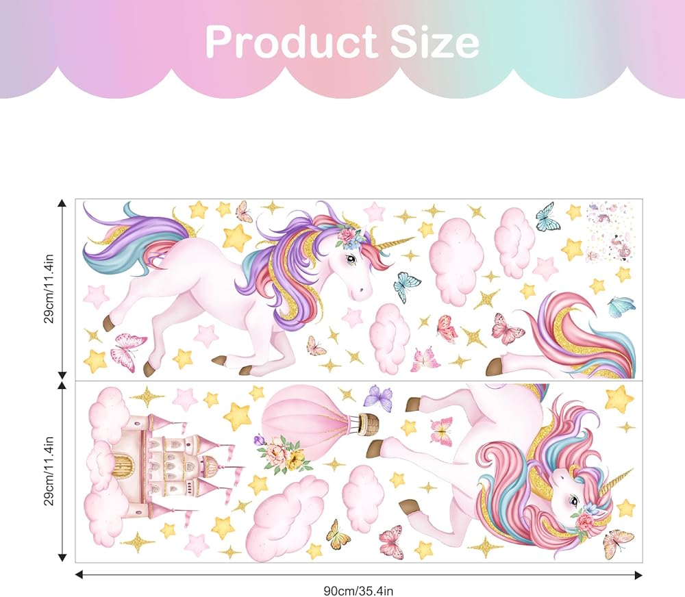 Reliable and Durable: Our unicorn wall decals are made of vinyl, ink and adhesive, it's easy to peel and stick, removable and waterproof. Also they are durable and fade resistant, can withstand daily wear and tear, as well as minor cleaning without losing their appearance.