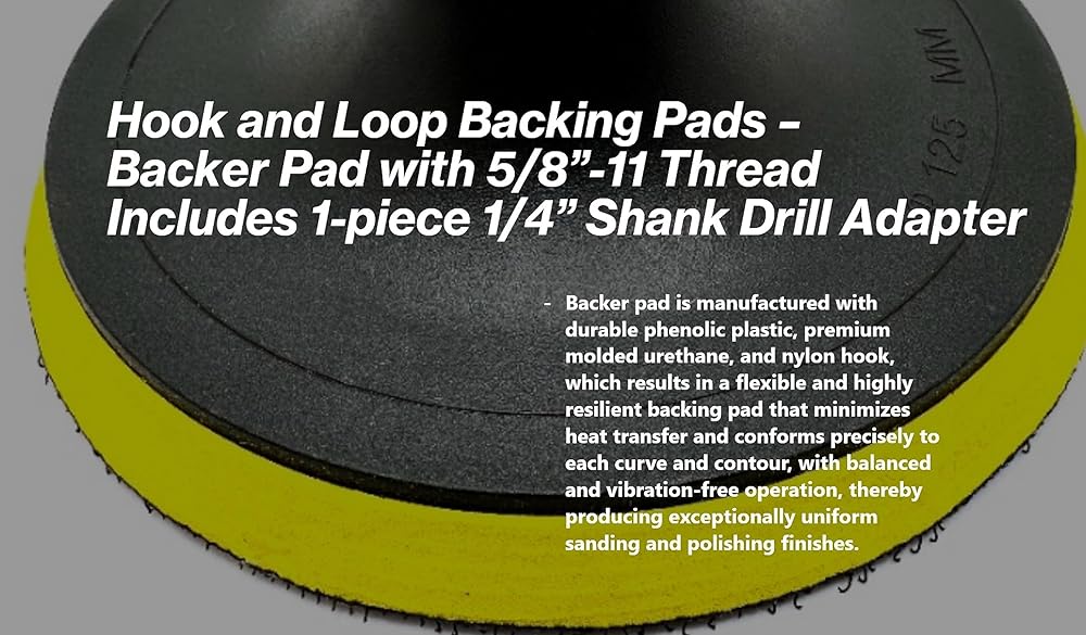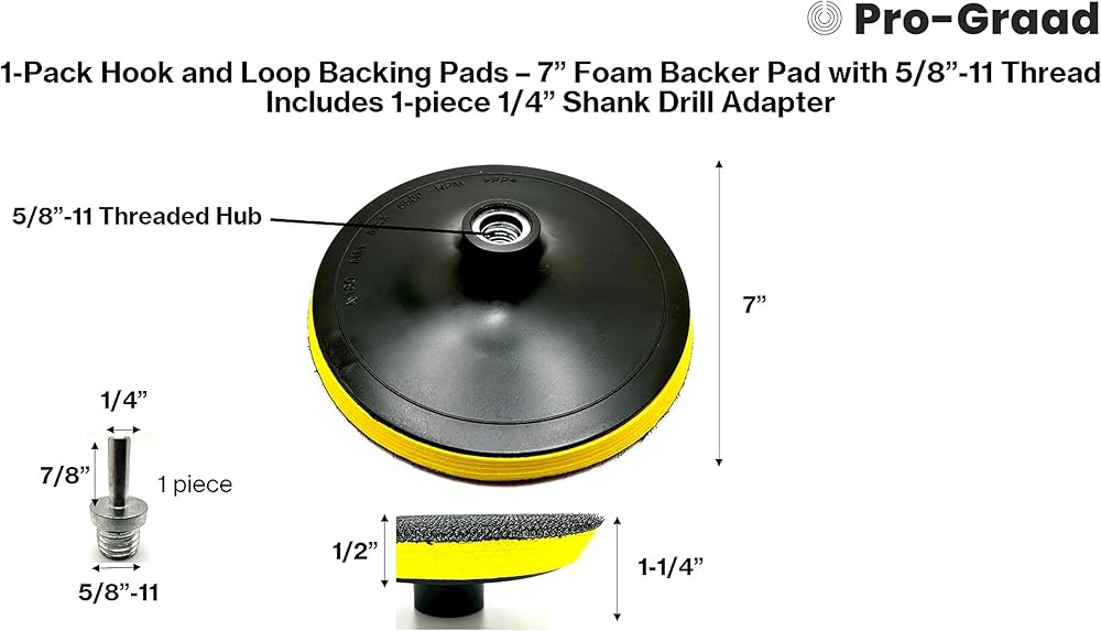 1 each 7" Hook and Loop backing pads and 1 each 1/4" Shank Drill Adapter for diamond polishing pads, sanding discs, buffing pads, and other grinding, sanding, polishing discs or pads with fuzzy loop backing. Backer pad is manufactured with durable phenolic plastic, premium molded urethane and nylon hook, which results in a flexible and highly resilient backing pad that minimizes heat transfer and conforms precisely to each curve and contour, with balanced and vibration-free operation, thereby producing exceptionally uniform sanding and polishing finishes. Max RPM 8,500. Pad features quick and easy sanding disc or polishing pad changes with the hook and loop attachment system. The pad's closely arranged nylon hooks on the pad face prevent sanding or polishing pad from shifting, spinning or detaching. All Pro-Graad products are made with quality materials, which exceed industrial grade standards. We are driven to deliver high-quality, high-performing products to the end user. This is why we stand behind our 100% Product Guarantee. If you are not satisfied with the product, simply return your purchase within 30 days, and we will replace or refund your order. Pro-Graad is a USA Company with US Based Customer Support.