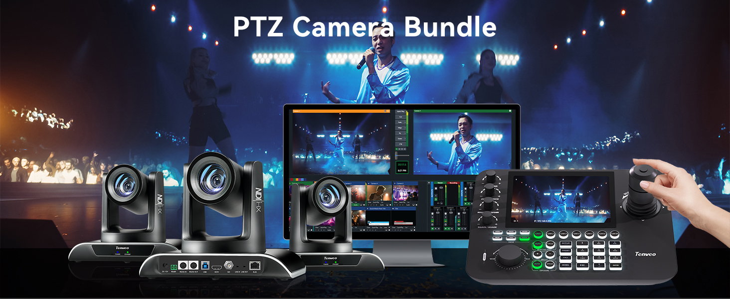 🌟Tenveo PTZ Camera, Joystick Controller and PoE Switch Kit is compatible with Video Switcher and Zoom, Teams, vMix, OBS and other Live Video Streaming Softwares. You also could make Multi-cameras video production for live streaming to YouTube and Facebook. Plug-and-play design ensures a quick and easy setup process and working seamlessly. This cost-effective set empowers you with professional-grade PTZ camera control, unlocking your camera's full potential.