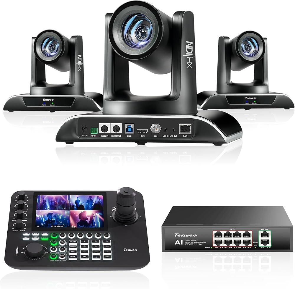 🌟Tenveo PTZ Camera Bundle INCLUDES: Tenveo AI Auto Tracking NDI PTZ Camera SDI/HDMI/USB3.0/LAN PoE 30X Optical +8X Digital Zoom (𝐕𝐇𝐃𝟔𝟑𝟎𝐀-𝐍𝐃𝐈 -3pcs), PTZ Camera Joystick Controller - 7'' LCD Quad-Screen Real-time Preview 4D Joystick NDI PTZ Controller(𝐊𝐁𝟑𝟎𝟎𝐏𝐑𝐎) and 8 Port Full Gigabit PoE Switch, which is ideal for Church Live Service, Video Conference, School, Hospital, Wedding, Live Streaming, Broadcast, Online Education, Product Launch, Video Production and House of Worship.