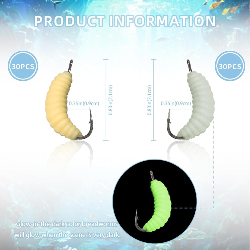 60pcs Value Pack – Regular & Luminous Versions: Includes 30 regular rubber maggot lures and 30 glow-in-the-dark maggot lures, each pre-rigged with stainless steel fishing hooks. Ideal for both daytime and low-light fishing conditions.