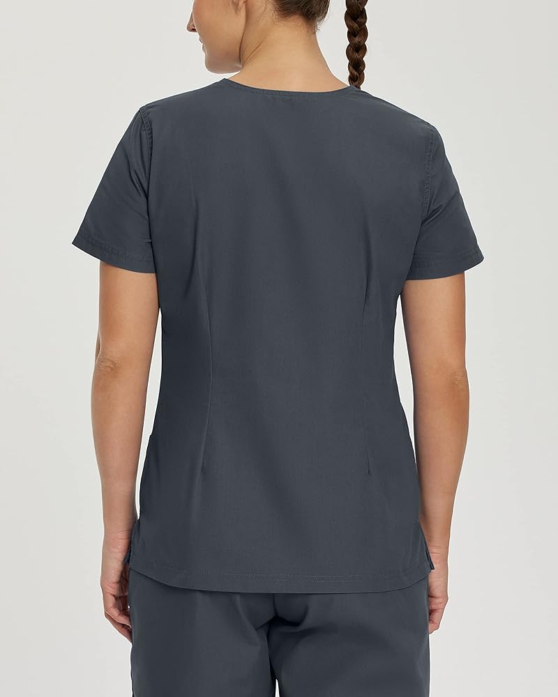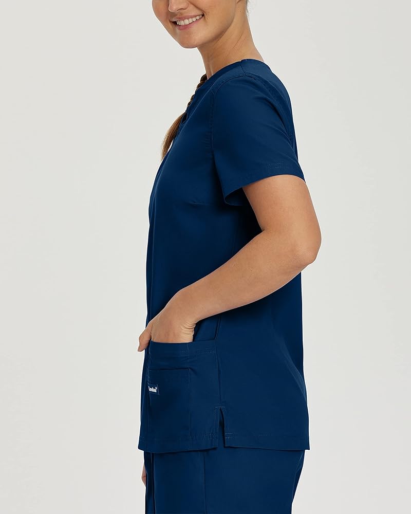 You'll never know comfort greater than this. The highly durable, banded V-neck scrub top maintains its style and integrity through countless washes-and it's industrial wash approved. On top of your double top-load pocket with interior scissor tape and medical accessory space, there's an extra accessory pocket on the side! With side vents to enhance ventilation and keep you comfortable, this flattering modern-fit top is brushed for added softness.