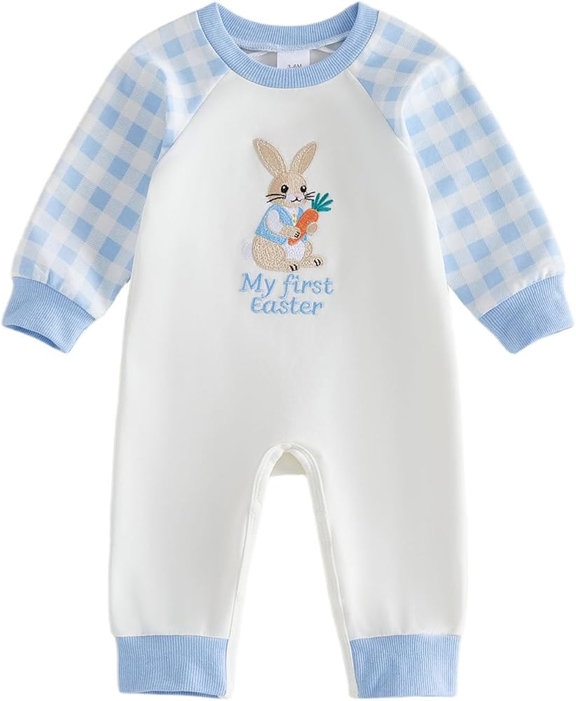 Dcohmch My First Easter Baby Boy Outfit Bunny Letter Embroidered Romper Long Sleeve Plaid Jumpsuit Newborn Infant Clothes