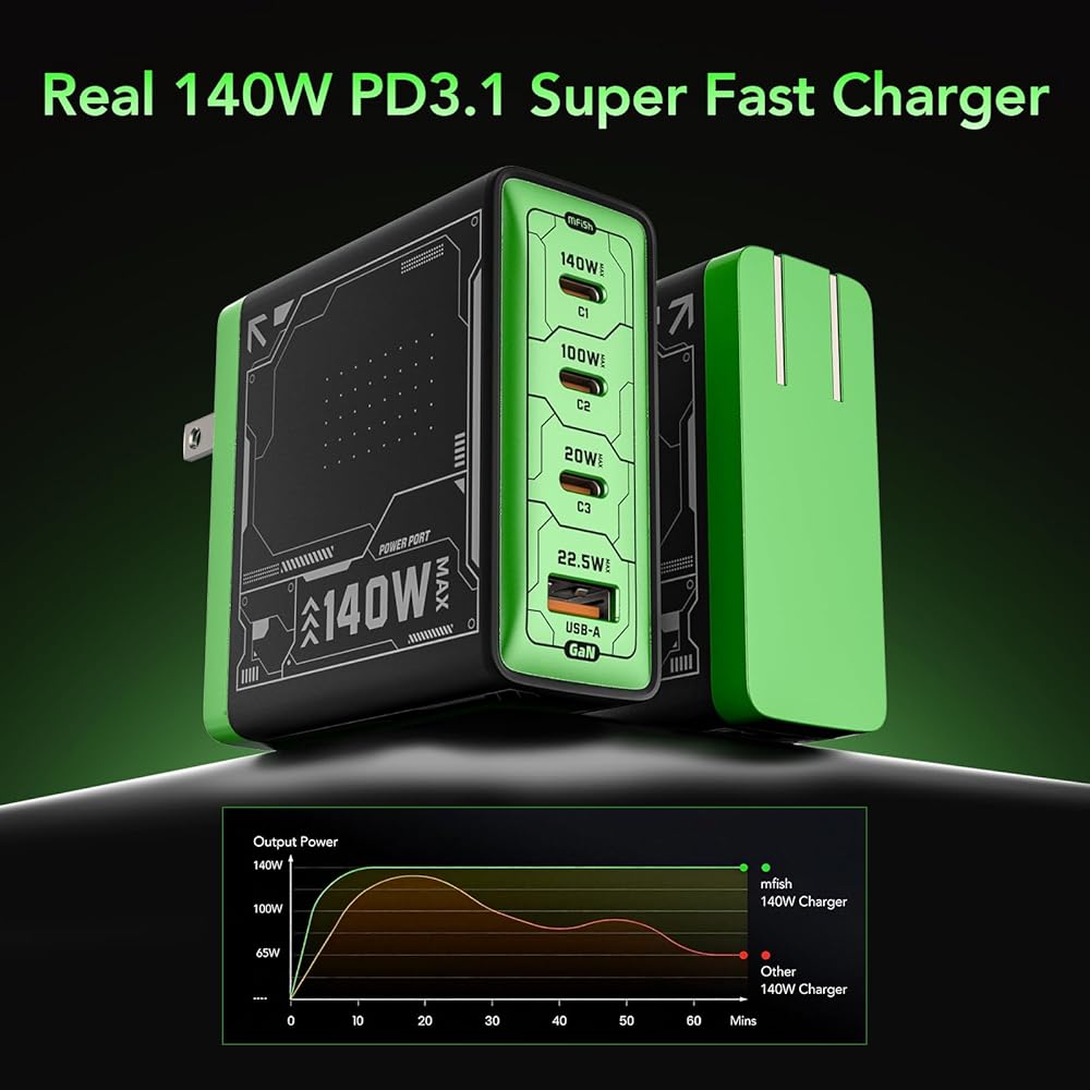 Experience next-generation fast charging with the Mfish 140W GaN Laptop Charger, engineered with advanced GaN technology to deliver powerful, efficient, and compact charging for all your USB-C devices. Designed for professionals and travelers, this USB C laptop charger ensures maximum performance while keeping your devices protected and your workspace clutter-free. The Mfish laptop charger supports up to 140W PD 3.1 fast charging, making it compatible with a wide range of laptops, tablets, and phones. Whether you need a MacBook charger, HP laptop charger, or Lenovo laptop charger, this all-in-one laptop charger Type C provides the perfect balance of speed and safety. Its intelligent power distribution automatically adjusts the output for each device, ensuring optimal performance without overheating or overcharging. With a sleek and portable design, the Mfish GaN charger is 30% smaller than traditional adapters but delivers even greater power efficiency. The foldable plug and detachable USB-C cable make it easy to pack for business trips or daily use. Its universal compatibility supports devices such as MacBook Pro, MacBook Air, HP Spectre, Lenovo ThinkPad, Dell XPS, iPad Pro, iPhone 15 Series, Samsung Galaxy, and more - a truly versatile USB-C laptop charger for modern lifestyles. Safety is built into every detail. Equipped with multiple protection systems against short-circuit, voltage fluctuation, and temperature rise, the Mfish laptop charger ensures a stable and reliable charging experience. The GaN chipset maintains cool operation even during high-power charging sessions, extending the lifespan of both your charger and your devices. Whether you're working at home, traveling, or studying, the Mfish 140W USB-C charger delivers fast, safe, and universal charging performance for all your devices. Power up your productivity with a single, efficient GaN laptop charger - the smarter way to charge your MacBook, HP, or Lenovo laptop anytime, anywhere.