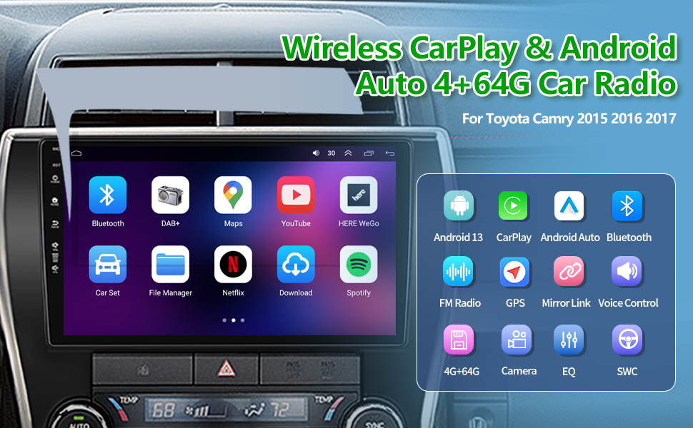 [4+64G] Android 13 Car Stereo with Wireless Apple Carplay & Android Auto for Toyota Camry 2015-2017 10.1" Touchscreen Radio Upgrade with AHD Camera,GPS Navigation,SWC,WiFi,FM,Bluetooth