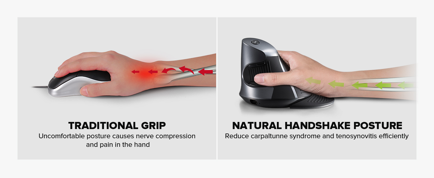 【Ergonomic Vertical Design】Unique vertical ergonomic computer mouse with special volute bionic design reduces arm discomfort and hand stiffness. Compared with traditional mouse, it may take a few days to get used to using the mouse with ergonomic vertical design