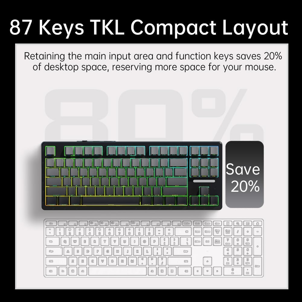 【Customizable RGB Backlighting with 21 Effects】Featuring 16.8 million colors and 21 backlight effects, the KM87PRO lets you personalize your keyboard's appearance to match your gaming rig; brightness and animation speed can be easily adjusted via FN key combinations, creating an immersive atmosphere for gaming and work alike.