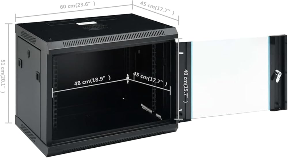 1. This 9U wall-mounted network cabinet is designed for organized, space-saving installation of standard 19-inch networking equipment like routers, switches, and fiber modems—ideal for home offices, server rooms, or telecom closets. Its compact outer dimensions (600 x 450 x 510 mm) fit seamlessly in tight spaces while offering ample internal volume (482 x 450 x 400 mm) for efficient cable management and airflow.